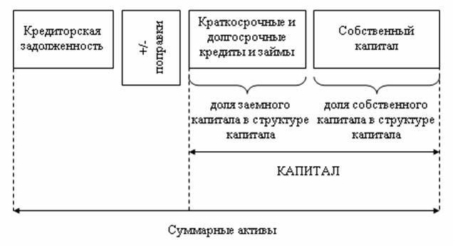 Рассчитав величину показателя КАПИТАЛ, можно определить долю заемных и собственных средств в пересчитанных пассивах предприятия согласно схеме, приведенной на рисунке 2.